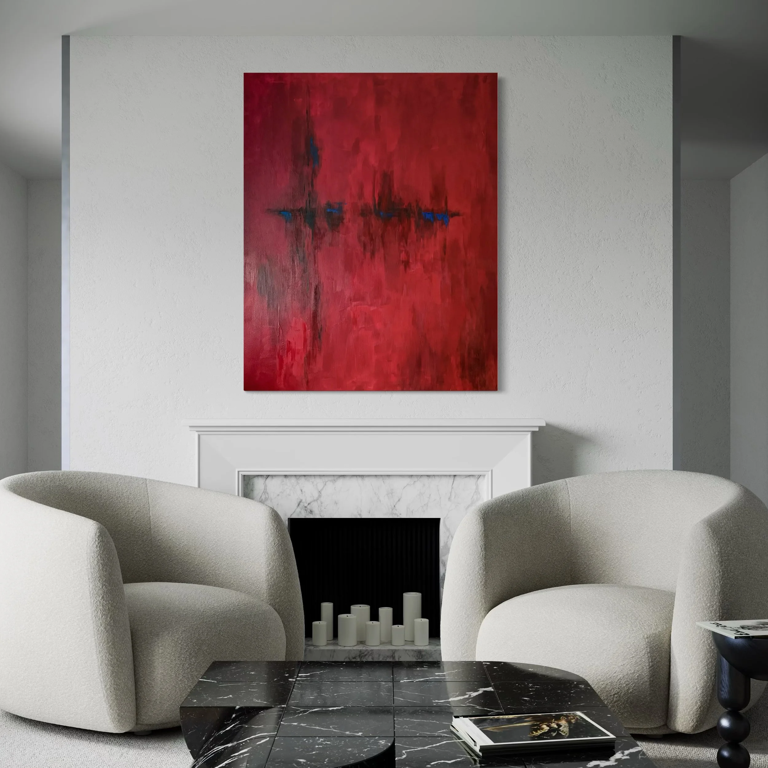 Eruption holds a red field under pressure. A scar-like rupture moves through the surface as a structural fault line where intensity has accumulated and partially released. Small flickers of color persist within it, like something that continues to surface.