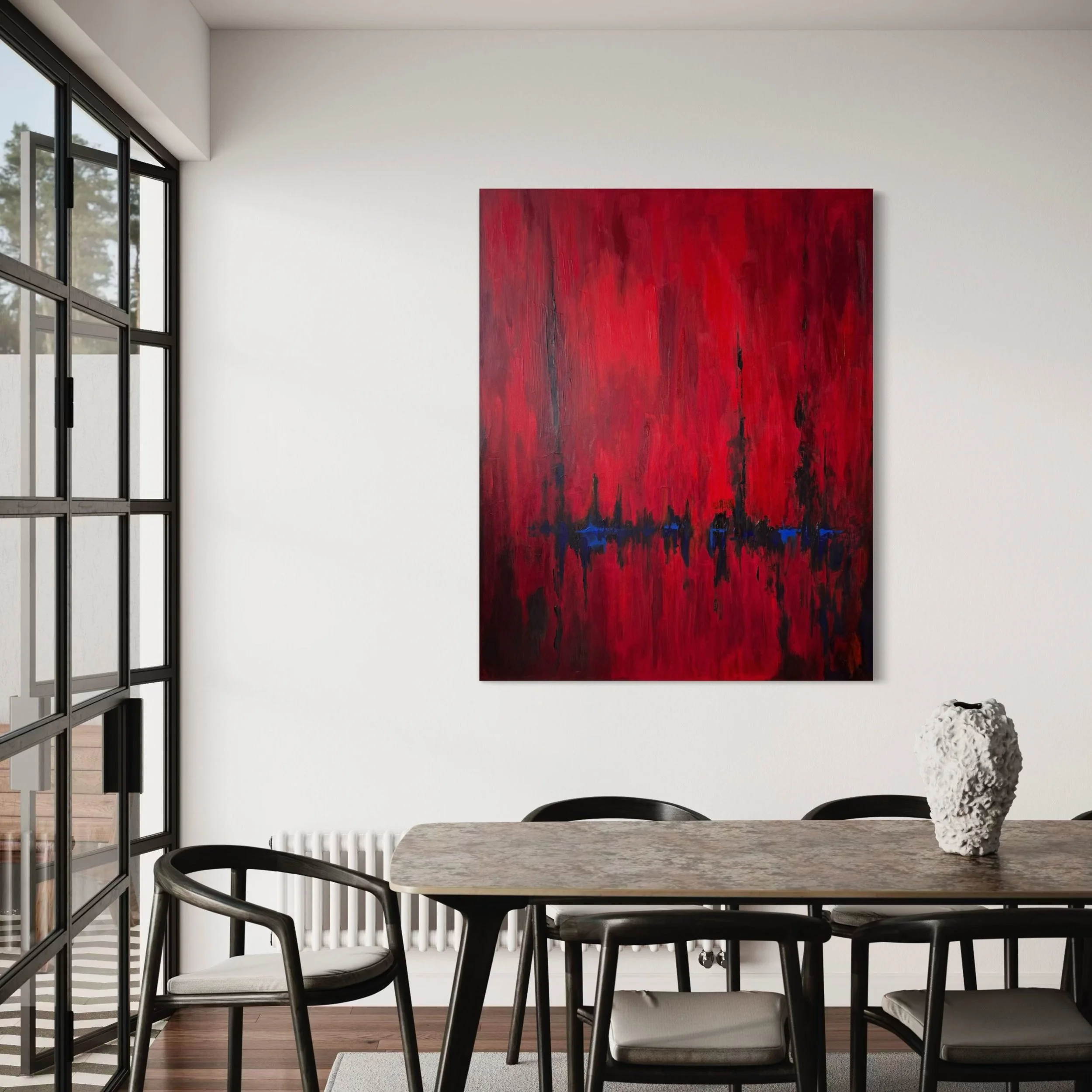 Fault Line captures the moment when pressure begins to break through the surface. A band of ultramarine and cobalt cuts across a dense red field, disrupting what had been suppressed or held in place.