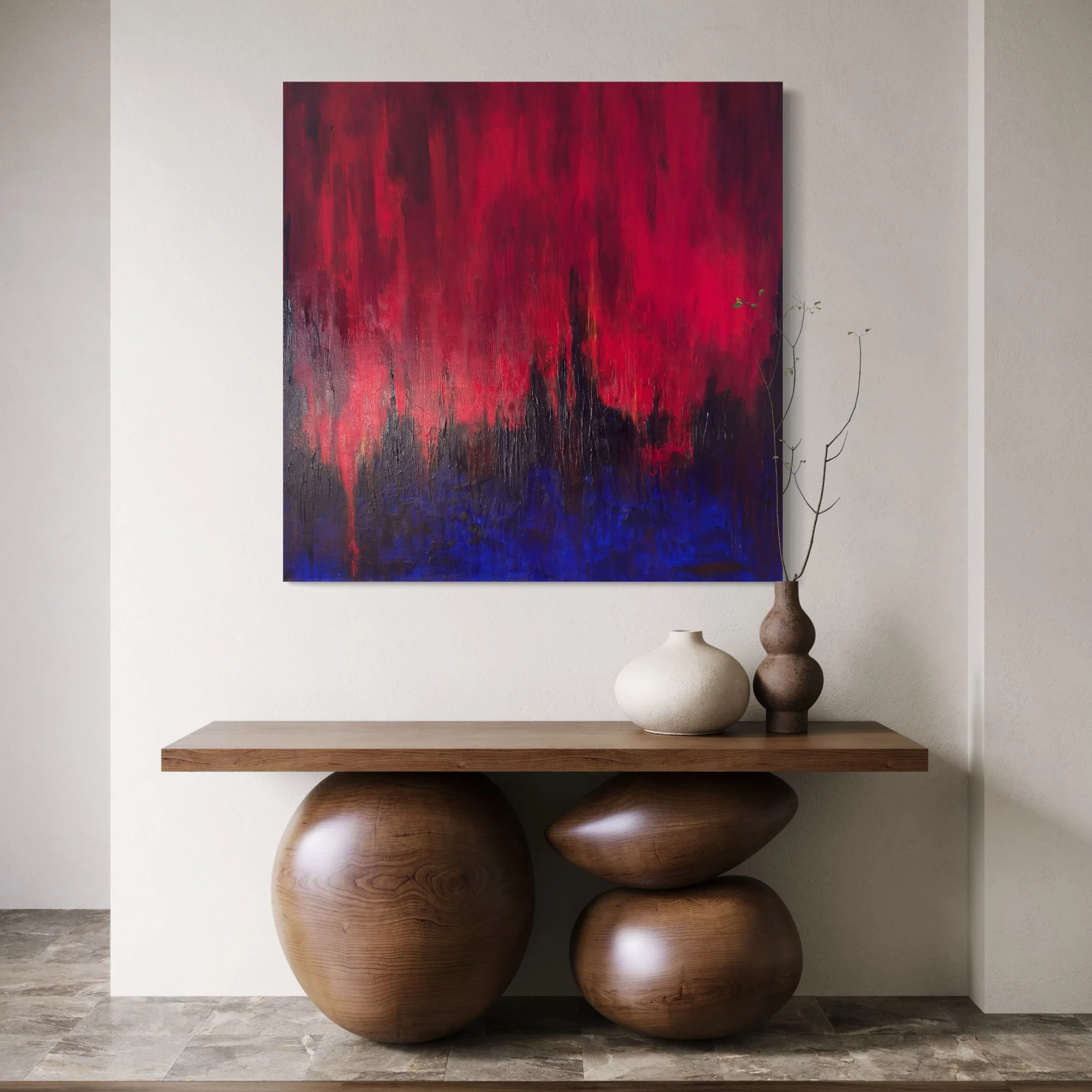 Pressure - Partial Release explores what remains when something gives way without fully breaking. A dense field of red meets a cooler blue band, creating a space of contained turbulence where energy is compressed, disrupted, and held in tension.